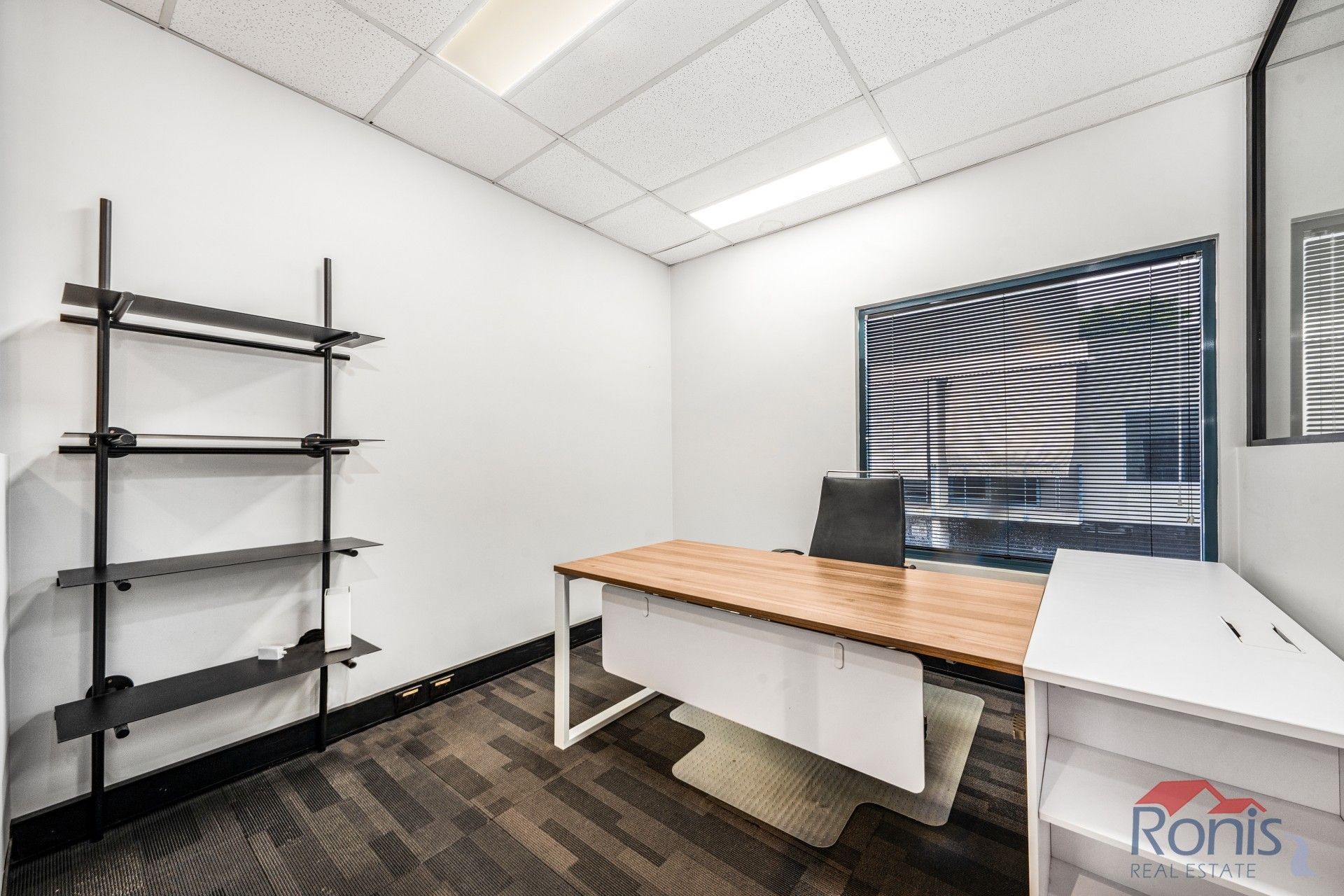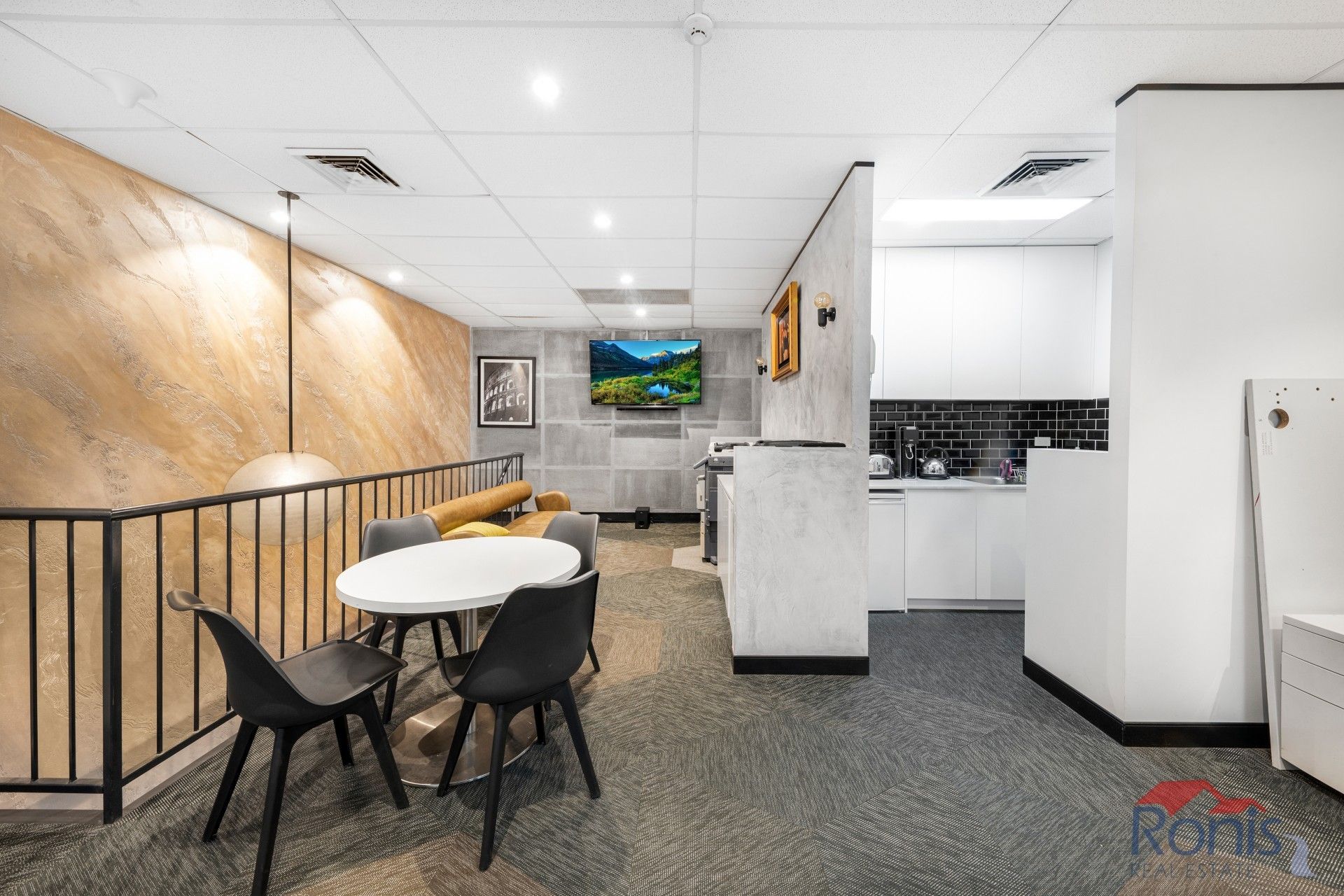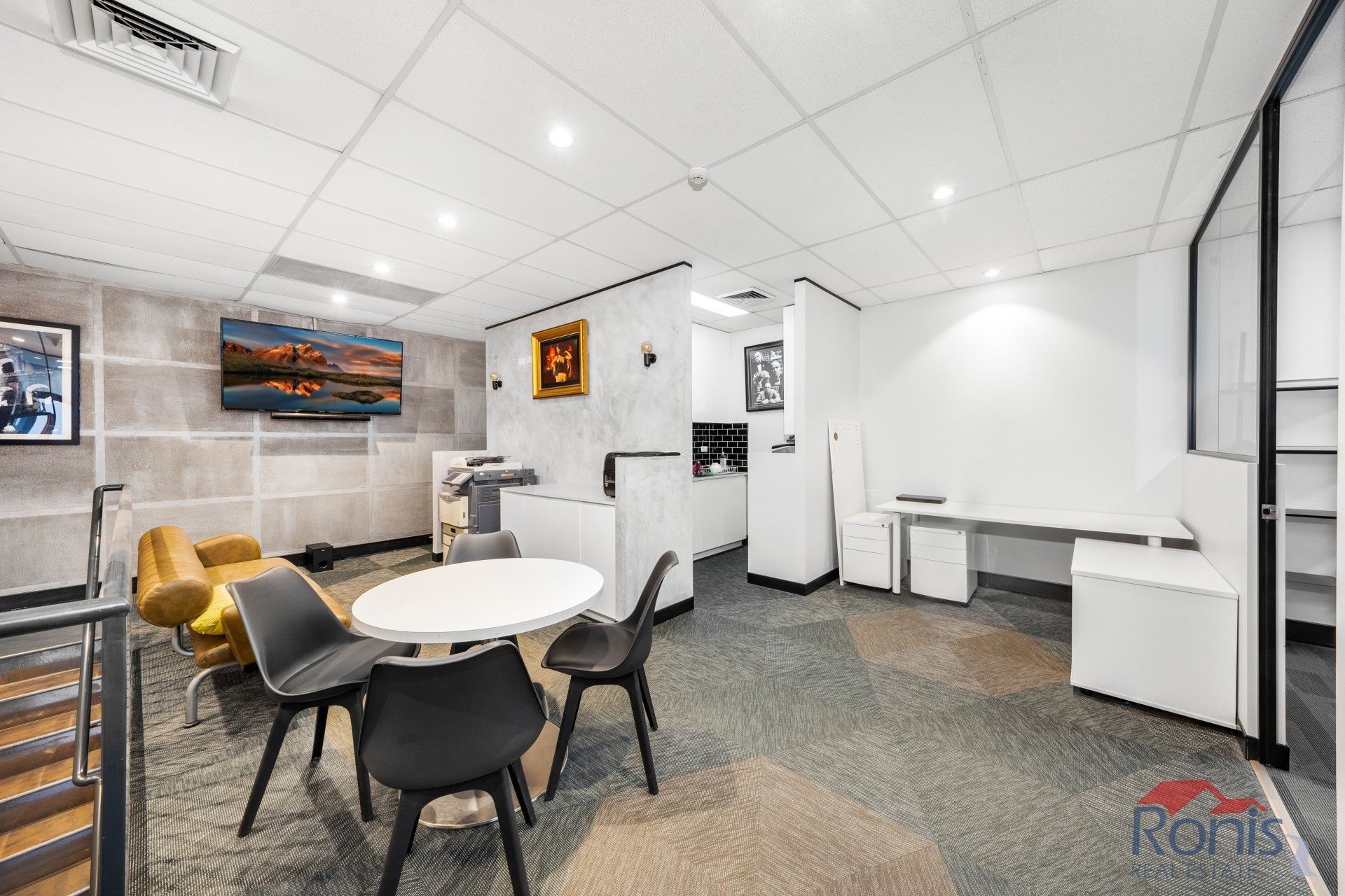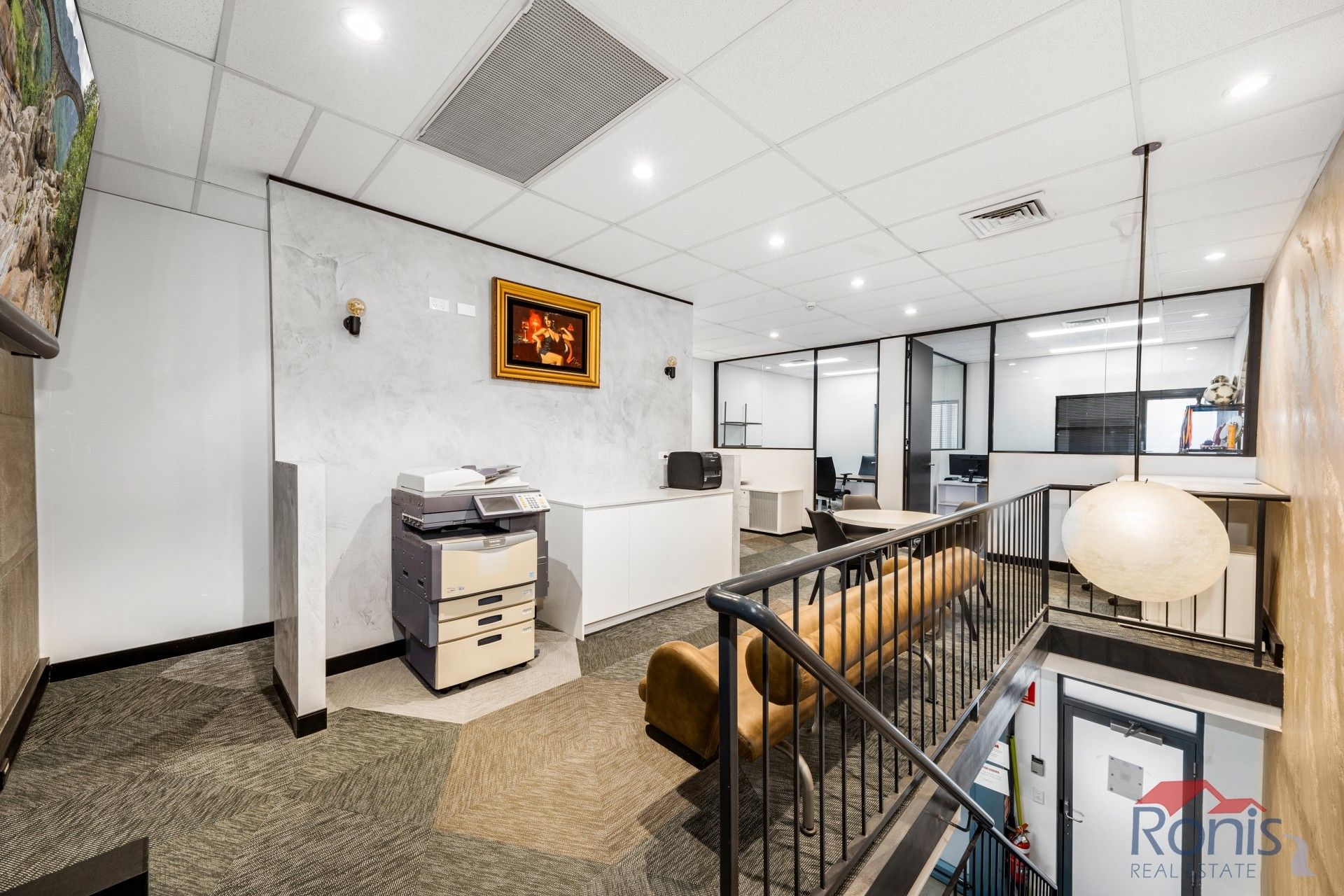 First floor has two enclosed offices, two hot desks/open plan workstations, updated kitchenette, toilet, ducted A/C and waiting area with art deco lounge chair.